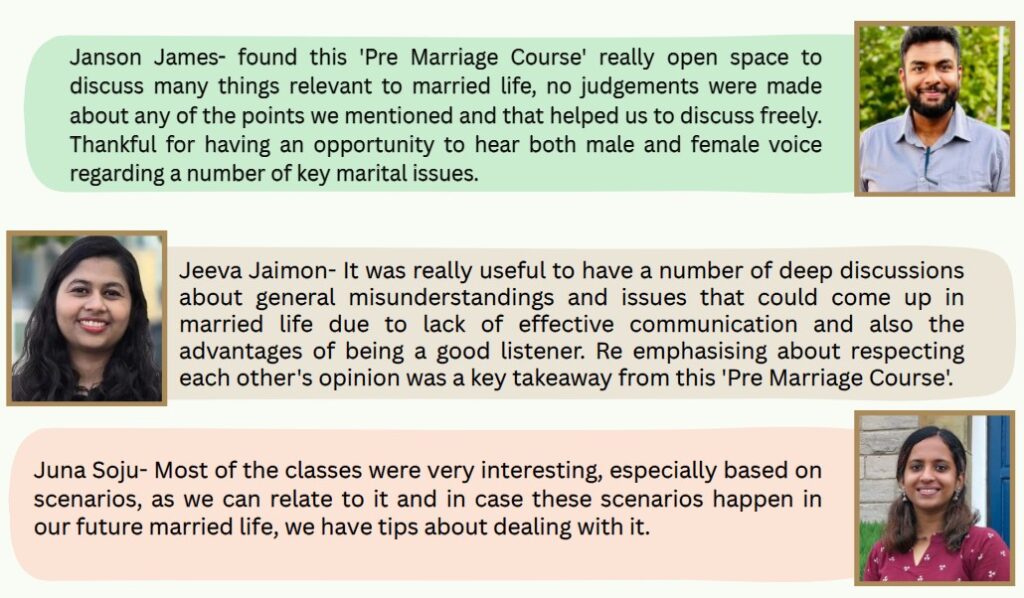 Every year three sessions are held to prepare our youngsters for a blessed married life in February, June & October and these sessions are well attended. Below are the testimonies provided by 4 youngsters who attended the ‘Pre Mrriage course’ in October 2025.